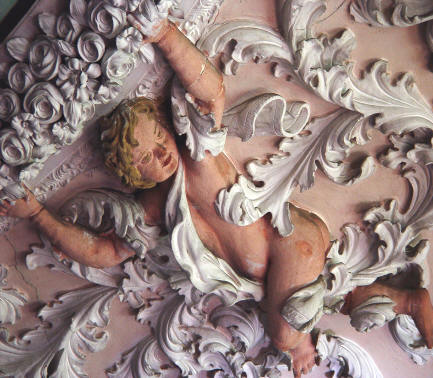 Stuck von Joseph Schmuzer Stukkatur spielt in Steinhausen wie in der Wies, in Weingarten wie Steingaden eine raumkünstlerisch wichtige Rolle. Da der Stuck im Dienste der Architektur stand, ergab sich in der Tradition der Wessobrunner "eine spannungsreiche, verwandtschaftliche Begegnung und Förderung zwischen Baumeistern und Stukkatoren". Ihre Werke bezeugen "einen Schulzusammenhang, eine Fortführung von Ideen, die die Rhythmisierung und Zentralisierung der barocken Kirchen anstrebten und die durch Generationen gepflegt werden", bis das reife Werk, z. B. die Wieskirche, entstand. |